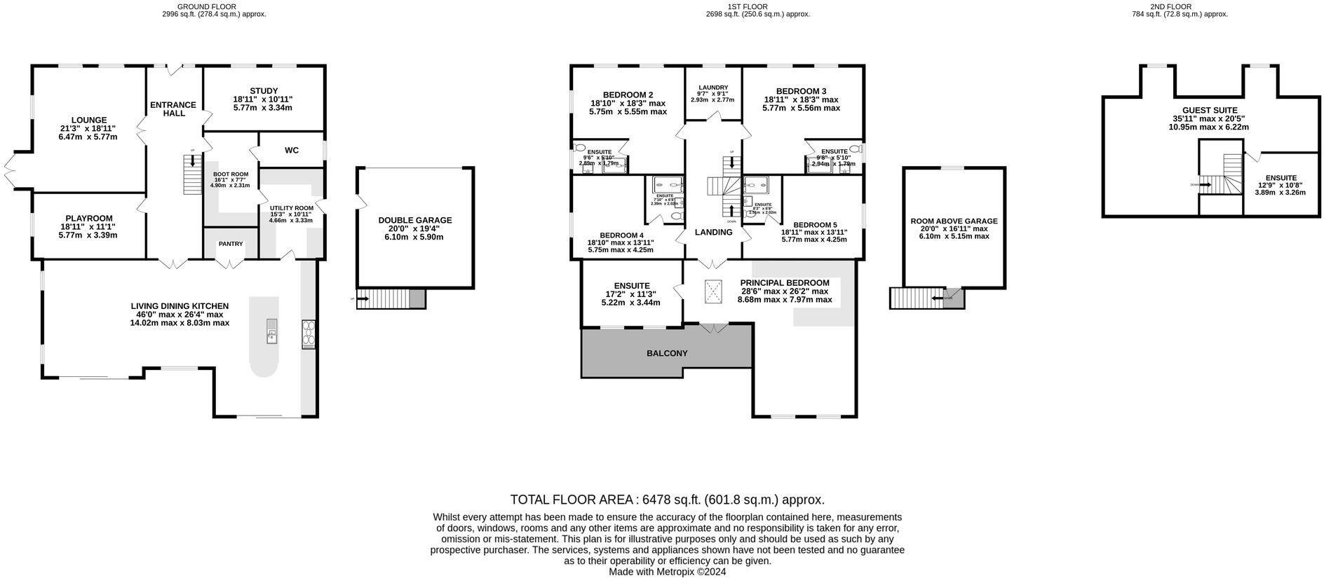 Upstairs, the first floor hosts five large double bedrooms, each with its own en-suite bathroom. The principal suite impresses with a walk-through dressing room, a luxurious en-suite bathroom, and access to a private balcony with fully vaulted ceilings. A dedicated laundry room adds convenience on this level. The second floor features a spacious guest suite with an en-suite bathroom.