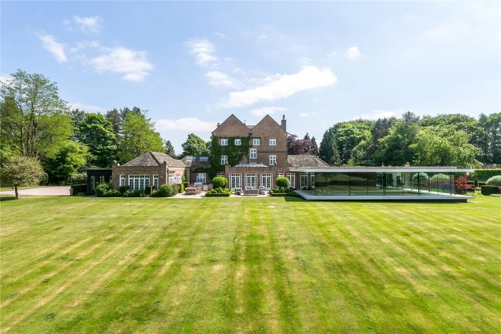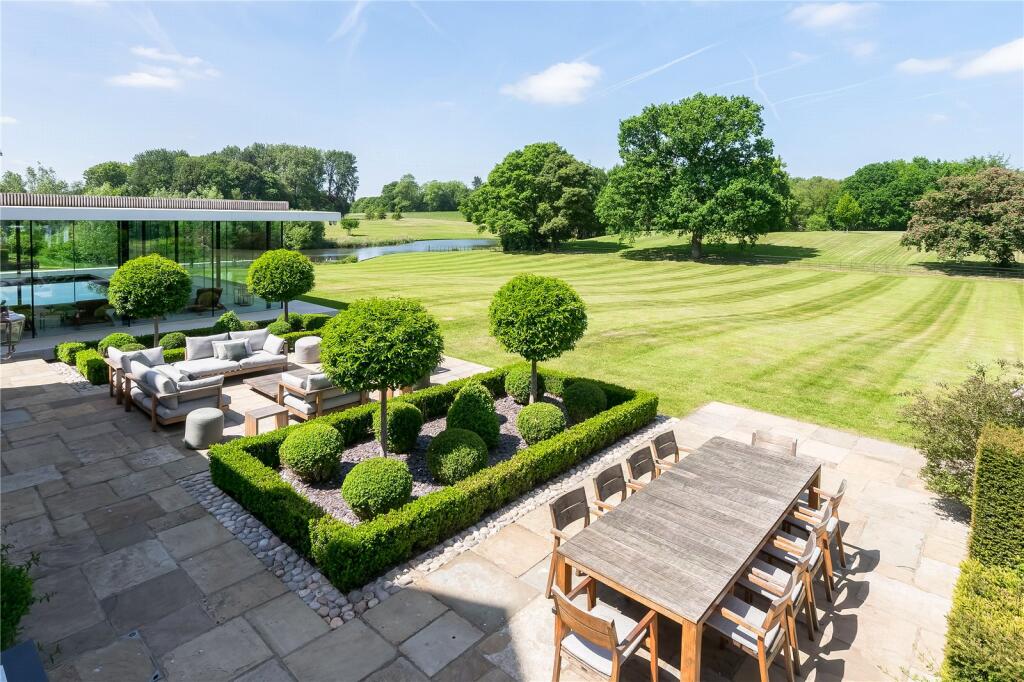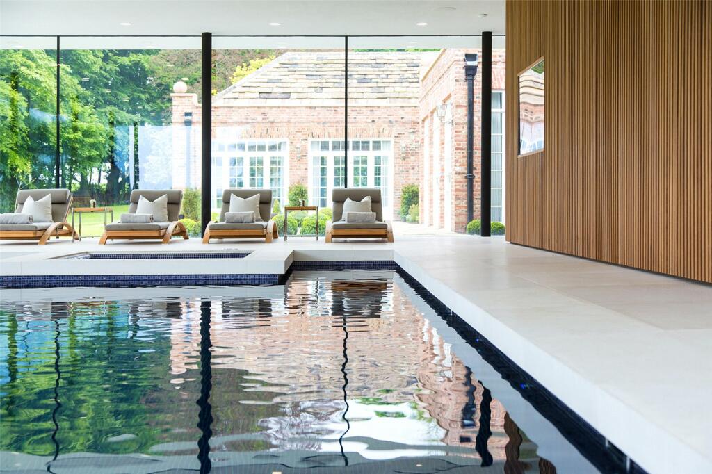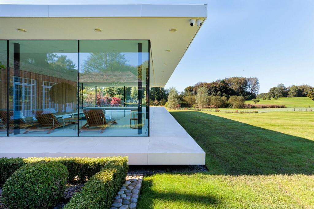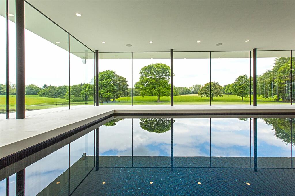 On the ground floor, a series of high-ceilinged reception rooms each serve a different purpose: a place for dining and sitting, a library for reading, a cinema room for watching films. The floors are laid with oak parquet, countertops in Arabescato Corchia marble define the kitchen and in the dining room, seagrass-lined walls add to the feeling of warmth. On the first and second floors are four bedrooms; the principal suite appointed with bespoke cabinetry in lacquered macassar ebony, and the bathrooms are Armani Brown & Botticino marble. It is the glass-walled contemporary leisure suite that really thrills, where the floor-to-ceiling glass harmonises with the period architecture and reflects the ever-green surrounds.