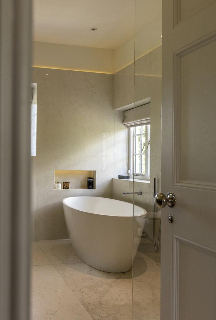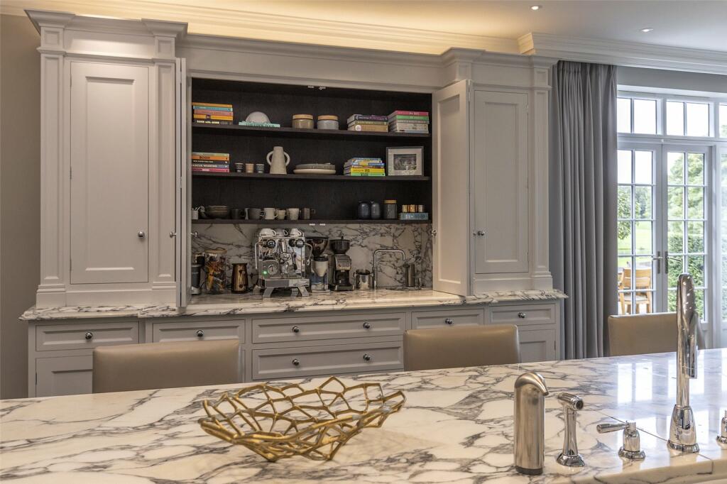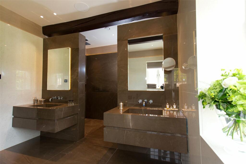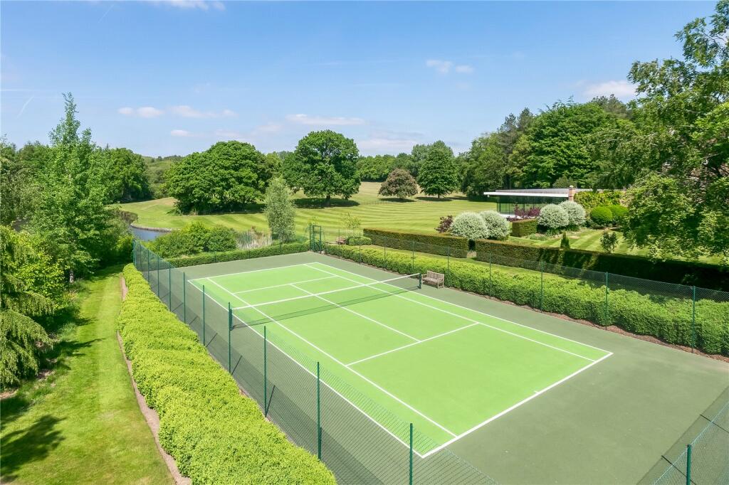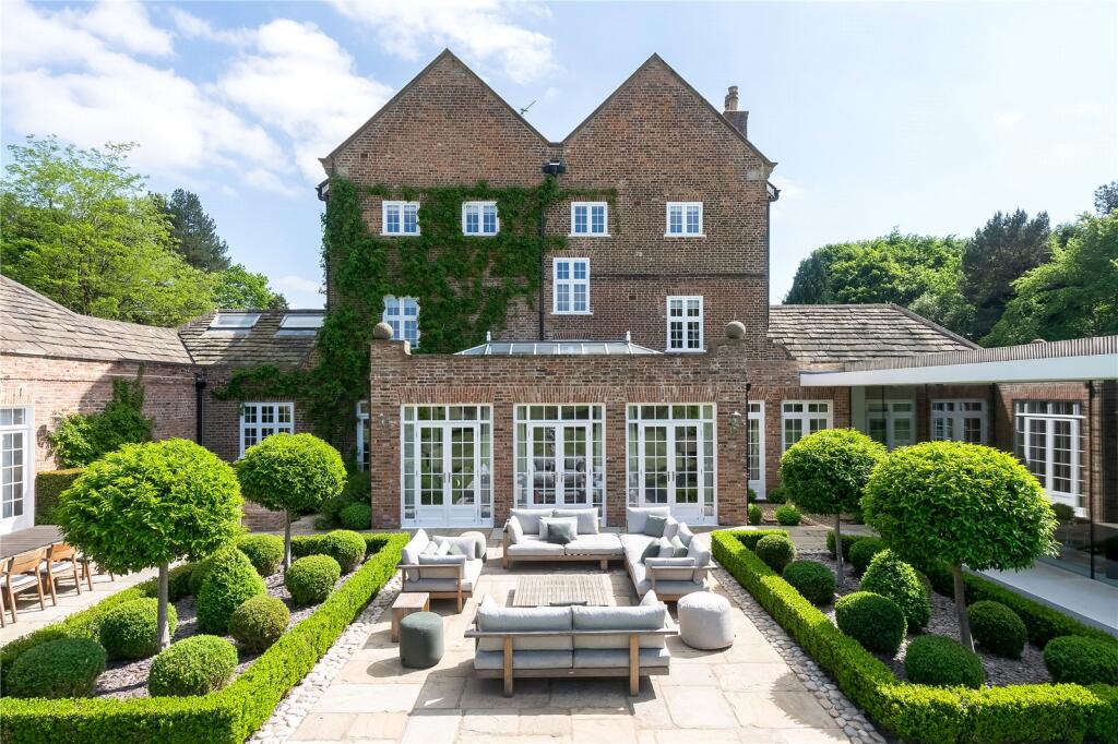 On the ground floor, a series of high-ceilinged reception rooms each serve a different purpose: a place for dining and sitting, a library for reading, a cinema room for watching films. The floors are laid with oak parquet, countertops in Arabescato Corchia marble define the kitchen and in the dining room, seagrass-lined walls add to the feeling of warmth. On the first and second floors are four bedrooms; the principal suite appointed with bespoke cabinetry in lacquered macassar ebony, and the bathrooms are Armani Brown & Botticino marble. It is the glass-walled contemporary leisure suite that really thrills, where the floor-to-ceiling glass harmonises with the period architecture and reflects the ever-green surrounds.