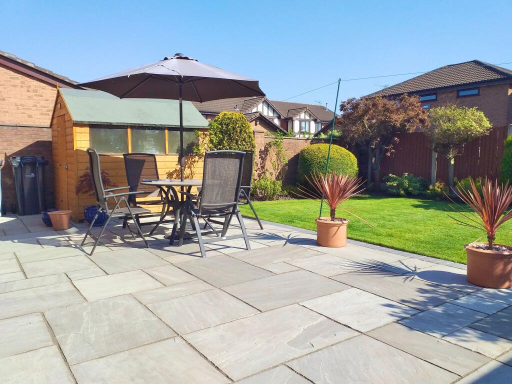 Outside, the rear garden provides a wonderful private escape. The attractive patio area offers ample space for outdoor seating and dining, creating an ideal setting for socialising with friends and family. Beyond, the neatly maintained lawn adds a serene and green outlook, making it a peaceful environment to unwind.