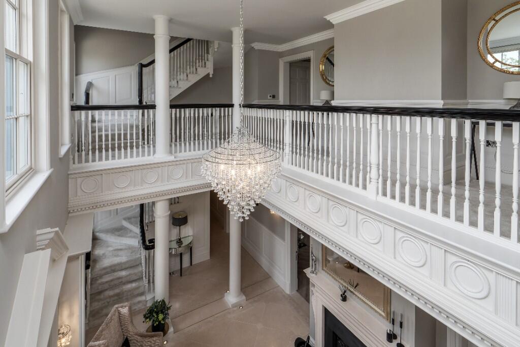 Approached via a private gated driveway, the house sits within approximately 3/4 of an acre with mature landscaped gardens and boasts a south facing rear aspect. The accommodation is centred around the impressive galleried landing and leading to a series of spacious reception rooms, all enjoying attractive outlooks over the grounds, alongside a large open plan kitchen and breakfast room that forms the heart of the home.