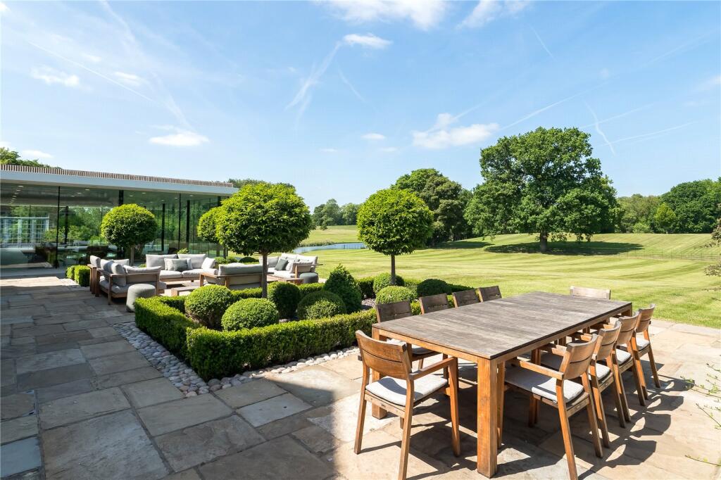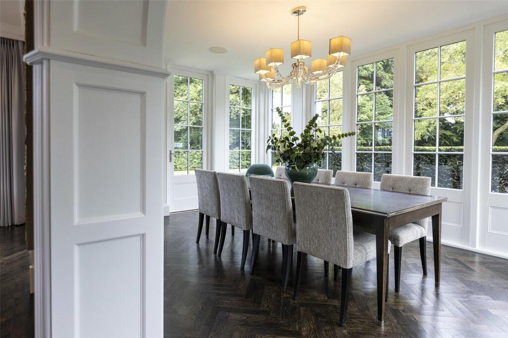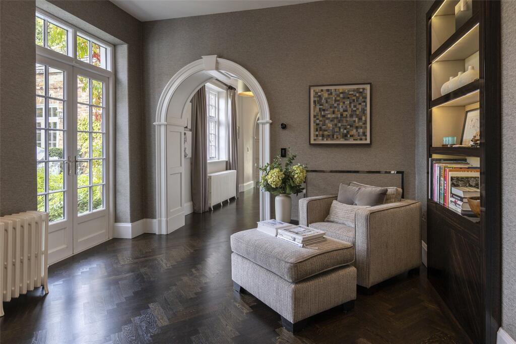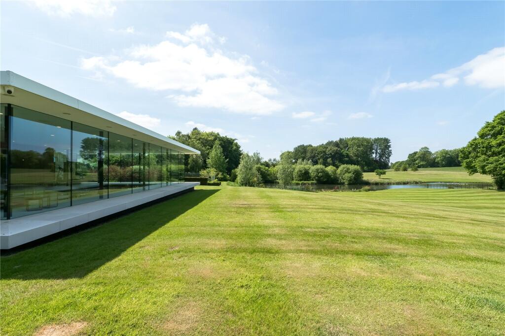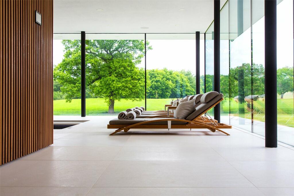 On the ground floor, a series of high-ceilinged reception rooms each serve a different purpose: a place for dining and sitting, a library for reading, a cinema room for watching films. The floors are laid with oak parquet, countertops in Arabescato Corchia marble define the kitchen and in the dining room, seagrass-lined walls add to the feeling of warmth. On the first and second floors are four bedrooms; the principal suite appointed with bespoke cabinetry in lacquered macassar ebony, and the bathrooms are Armani Brown & Botticino marble. It is the glass-walled contemporary leisure suite that really thrills, where the floor-to-ceiling glass harmonises with the period architecture and reflects the ever-green surrounds.