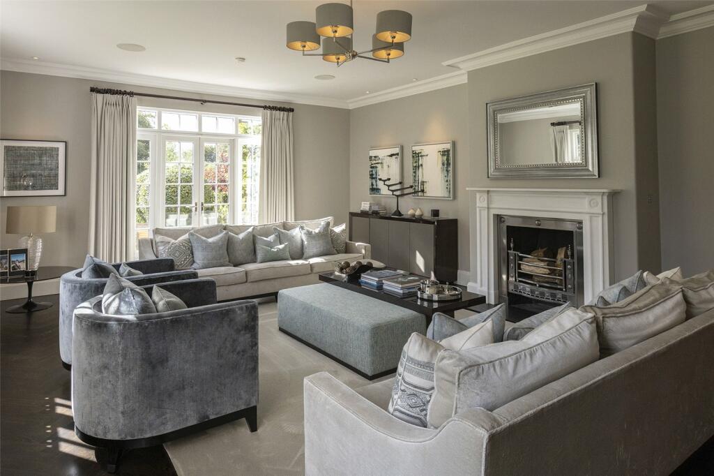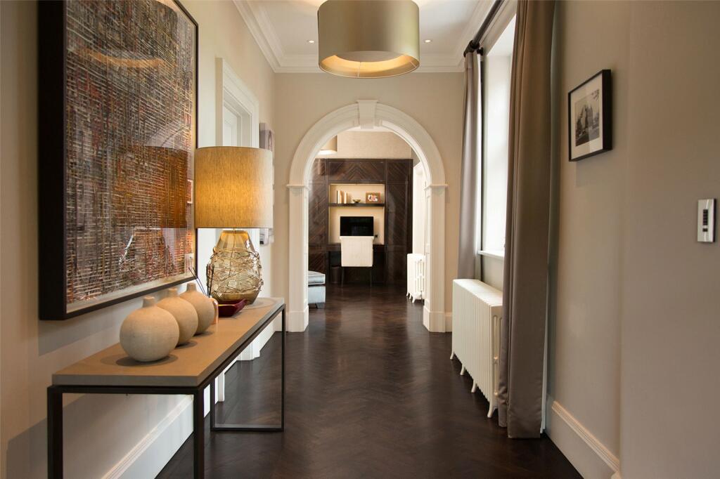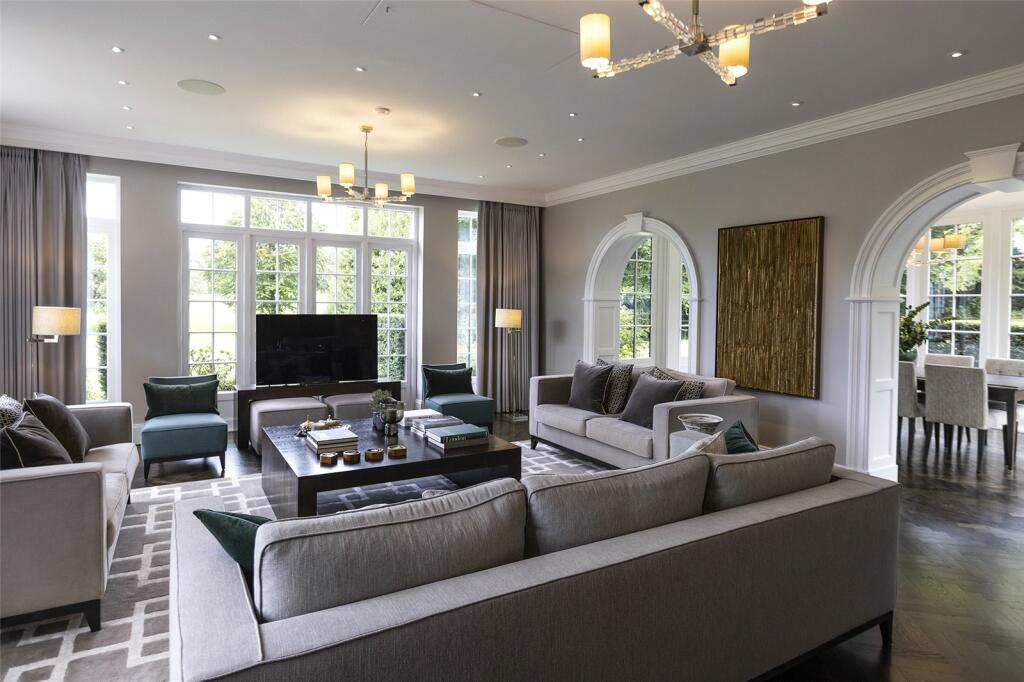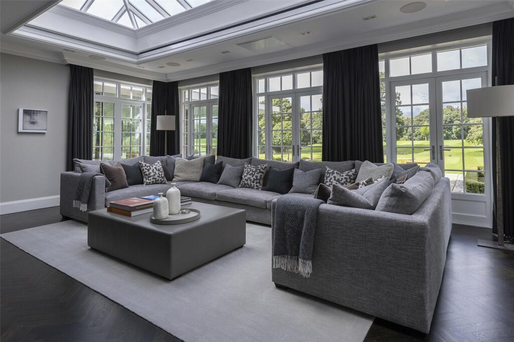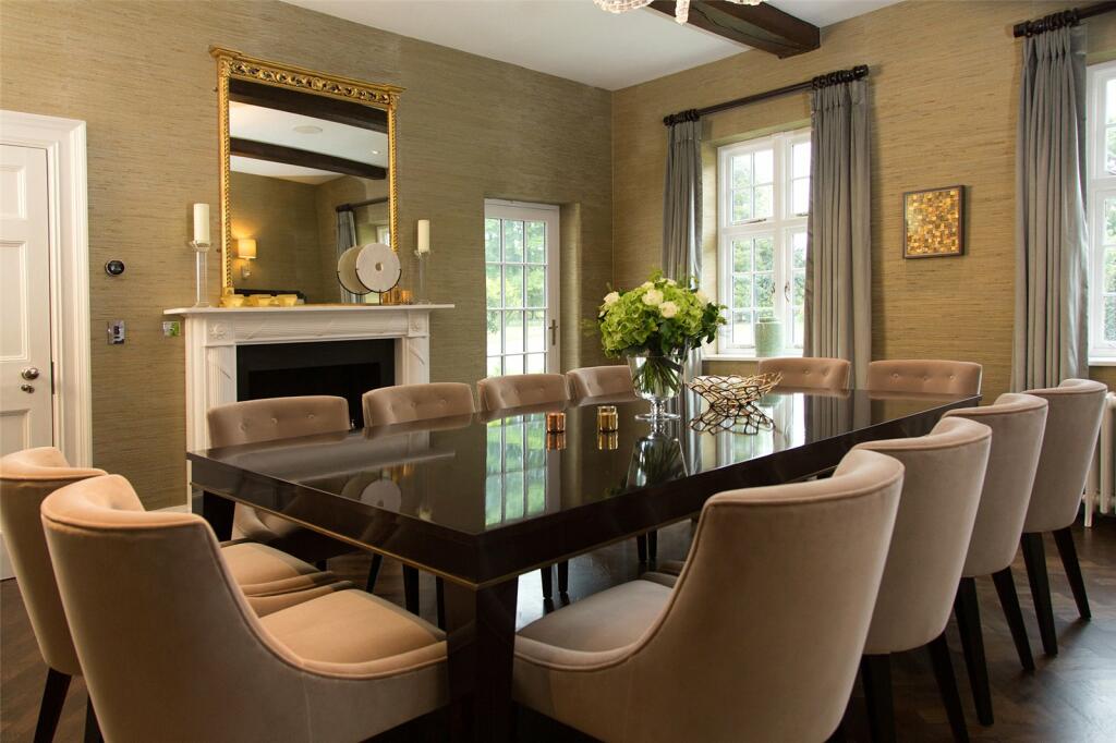 On the ground floor, a series of high-ceilinged reception rooms each serve a different purpose: a place for dining and sitting, a library for reading, a cinema room for watching films. The floors are laid with oak parquet, countertops in Arabescato Corchia marble define the kitchen and in the dining room, seagrass-lined walls add to the feeling of warmth. On the first and second floors are four bedrooms; the principal suite appointed with bespoke cabinetry in lacquered macassar ebony, and the bathrooms are Armani Brown & Botticino marble. It is the glass-walled contemporary leisure suite that really thrills, where the floor-to-ceiling glass harmonises with the period architecture and reflects the ever-green surrounds.