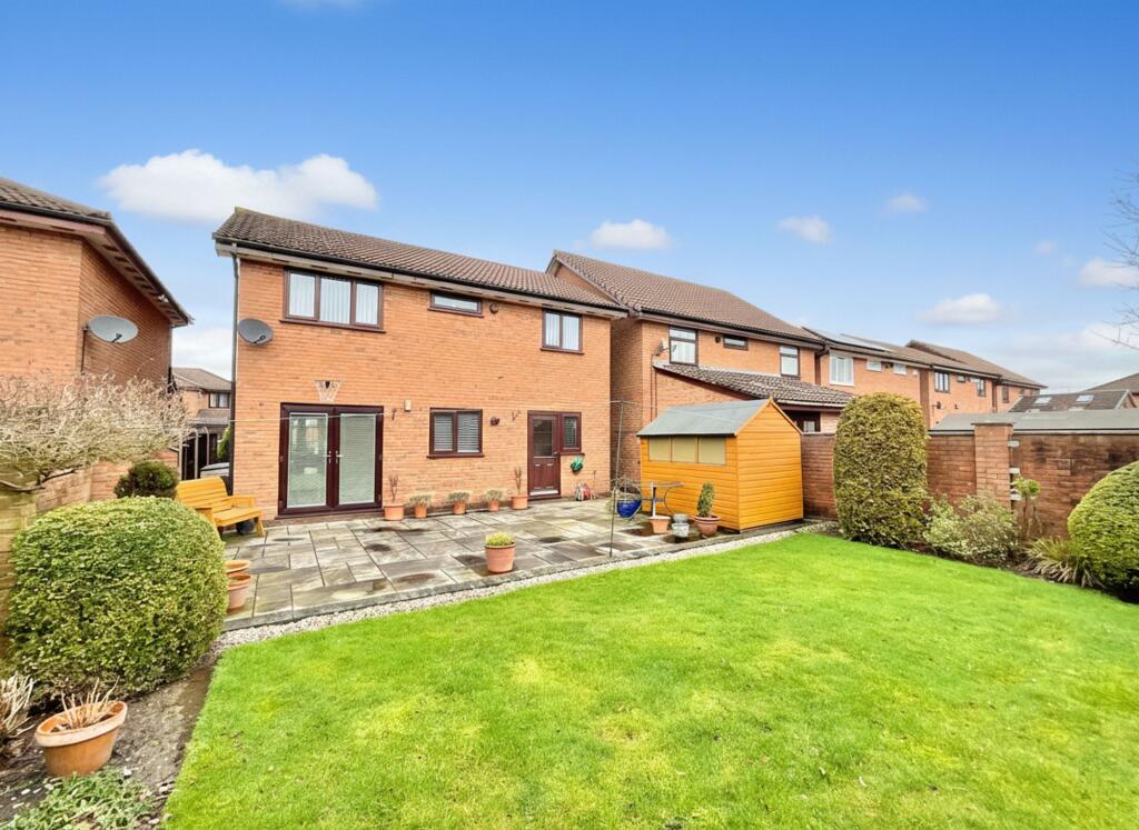 Outside, the rear garden provides a wonderful private escape. The attractive patio area offers ample space for outdoor seating and dining, creating an ideal setting for socialising with friends and family. Beyond, the neatly maintained lawn adds a serene and green outlook, making it a peaceful environment to unwind.