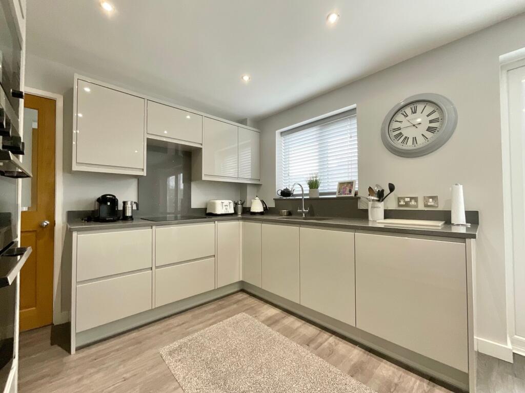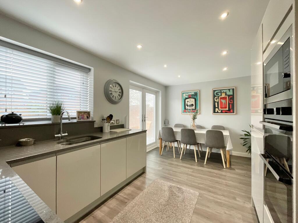 To the rear of the property, the impressive kitchen/diner forms the true heart of the home. Designed with a sleek, modern finish, it features an abundance of fitted cabinets providing excellent storage, complemented by integrated appliances including double ovens, fridge, freezer for a streamlined look. There is ample space for a family dining table, making it an ideal environment for both everyday meals and entertaining guests. Elegant French doors open directly onto the rear garden, allowing natural light to pour into the space while creating a seamless connection between indoors and out — perfect for summer barbecues, children playing outside, or relaxed al fresco dining on warm evenings. An understairs cupboard, conveniently accessed from the kitchen, provides fantastic additional storage and keeps household essentials neatly tucked away.
