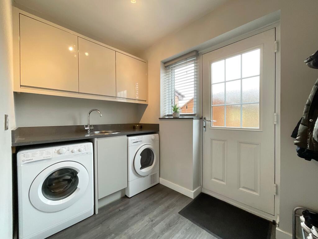 The adjoining utility room further enhances the home’s functionality, offering dedicated space for both a washing machine and dryer, along with a separate sink and additional cupboards — keeping laundry tasks discreetly separate from the main living areas. A convenient downstairs WC completes the thoughtfully designed ground floor.