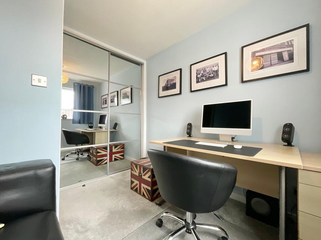 Bedroom two mirrors the generous proportions of the master and also benefits from built-in wardrobes, making it ideal for family members or long-term guests. Bedroom three, currently arranged as a welcoming guest room, is slightly smaller yet comfortably accommodates a double bed and includes its own built-in wardrobe, offering excellent versatility. Bedroom four is a well-proportioned single room with fitted storage, presently used as a home office/study. However, its flexible layout would suit a nursery, hobby room, or additional bedroom with ease.