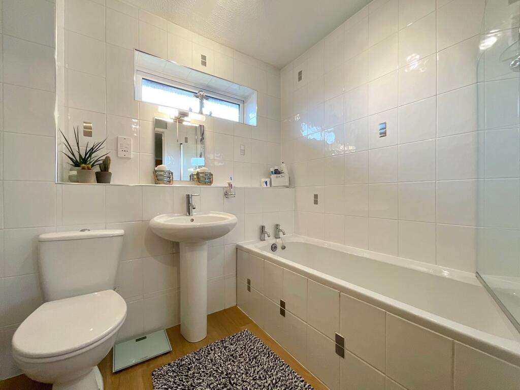 The main family bathroom is tastefully appointed with a bath and overhead shower, offering both practicality and comfort for busy mornings or relaxing soaks.